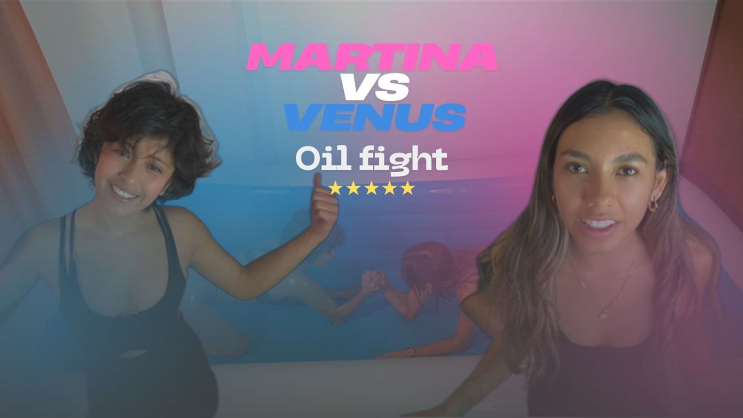This is my oil fight match against Venus. Our first round is in bikinis, the second is in topless, and the third is completely naked and, above all, covered in lots of oil.
